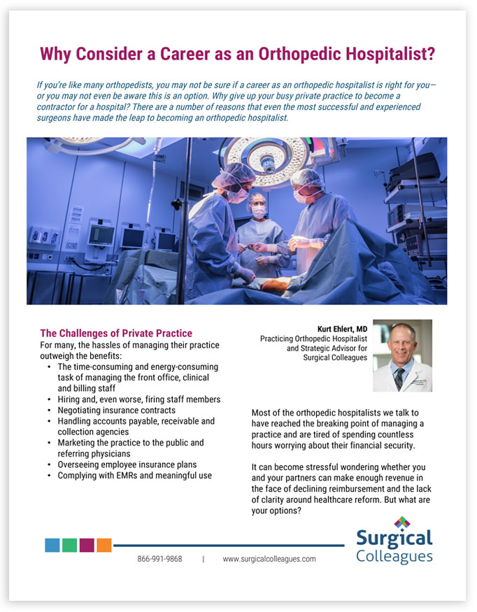 Surgical Colleagues is a hospital-based partner/practice vs. a staffing model. Our only focus is specialty call for Acute Care and Trauma Surgery, Orthopedic Surgery, and Neurosurgery. We make sure you have the practice environment, key infrastructure, and support from the hospital and Surgical Colleagues to optimize care and patient satisfaction.